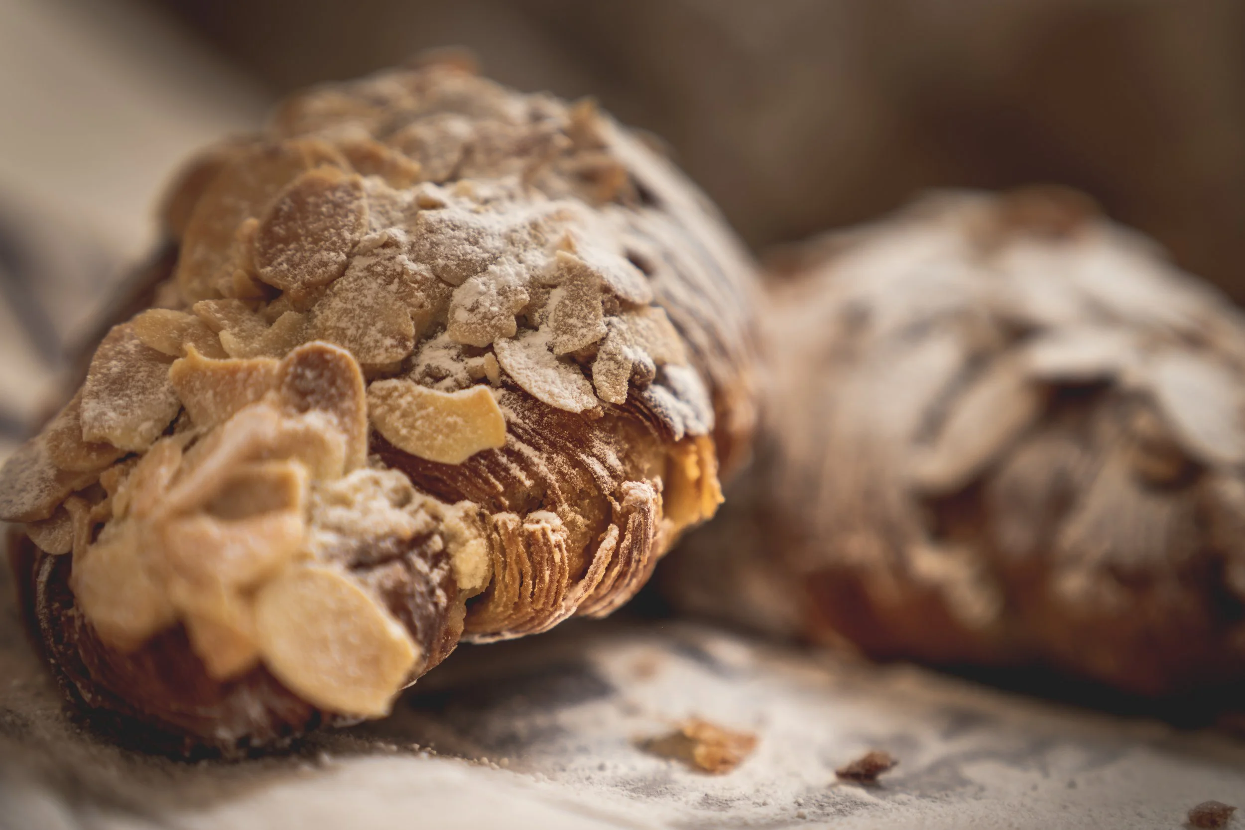 Made in the true French style. We take day old croissants and soak them in an almond syrup, before filling them with our handmade almond cream. They are then topped with more cream, following by a generous coating of flaked almonds, and finished with a sprinkling of icing sugar.